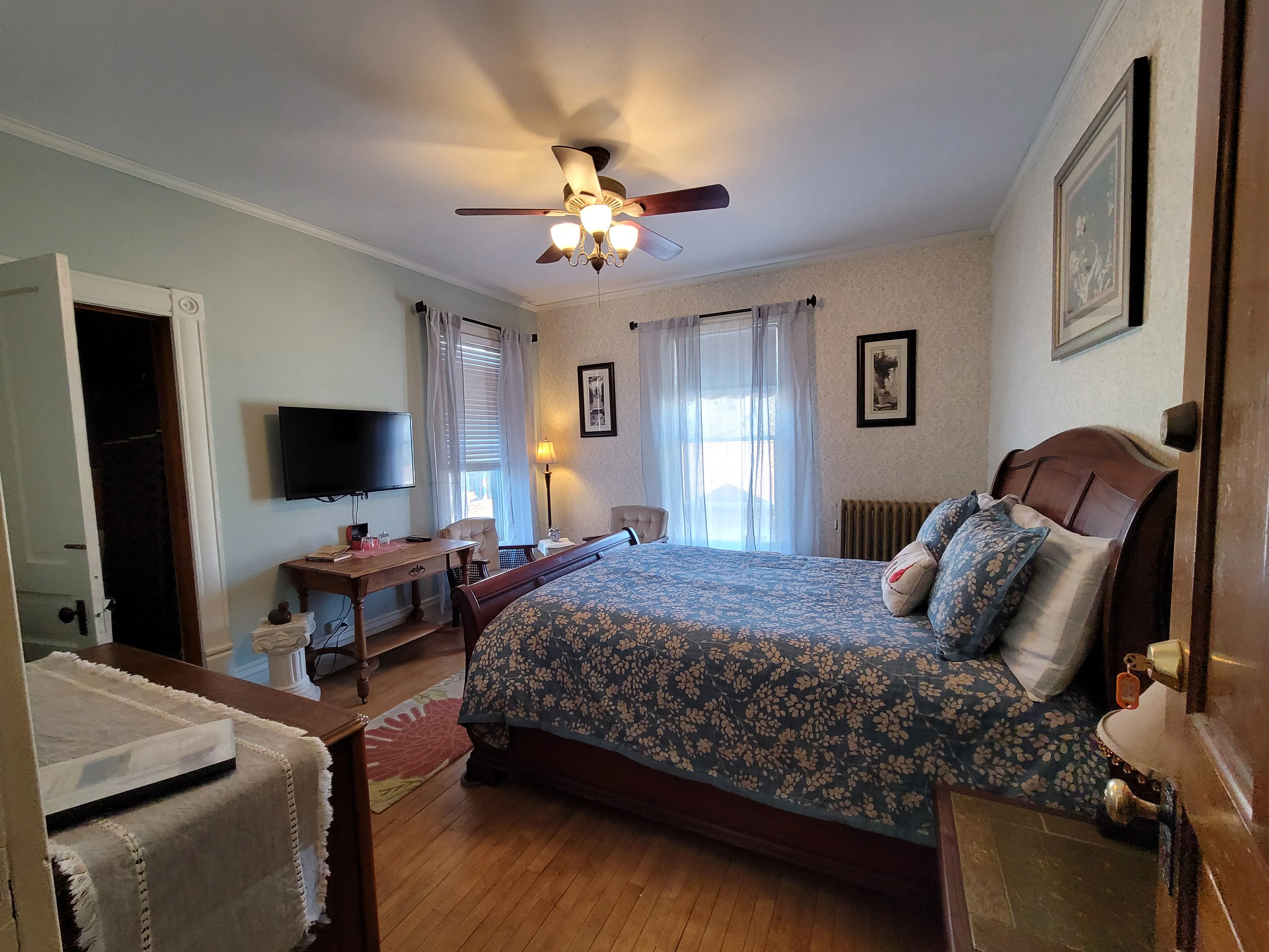 Our Deluxe Queen Rooms have private full bathrooms with a clawfoot tub and shower. Comfortable queen bed and sitting area with smart TV in each room. Nicely decorated.